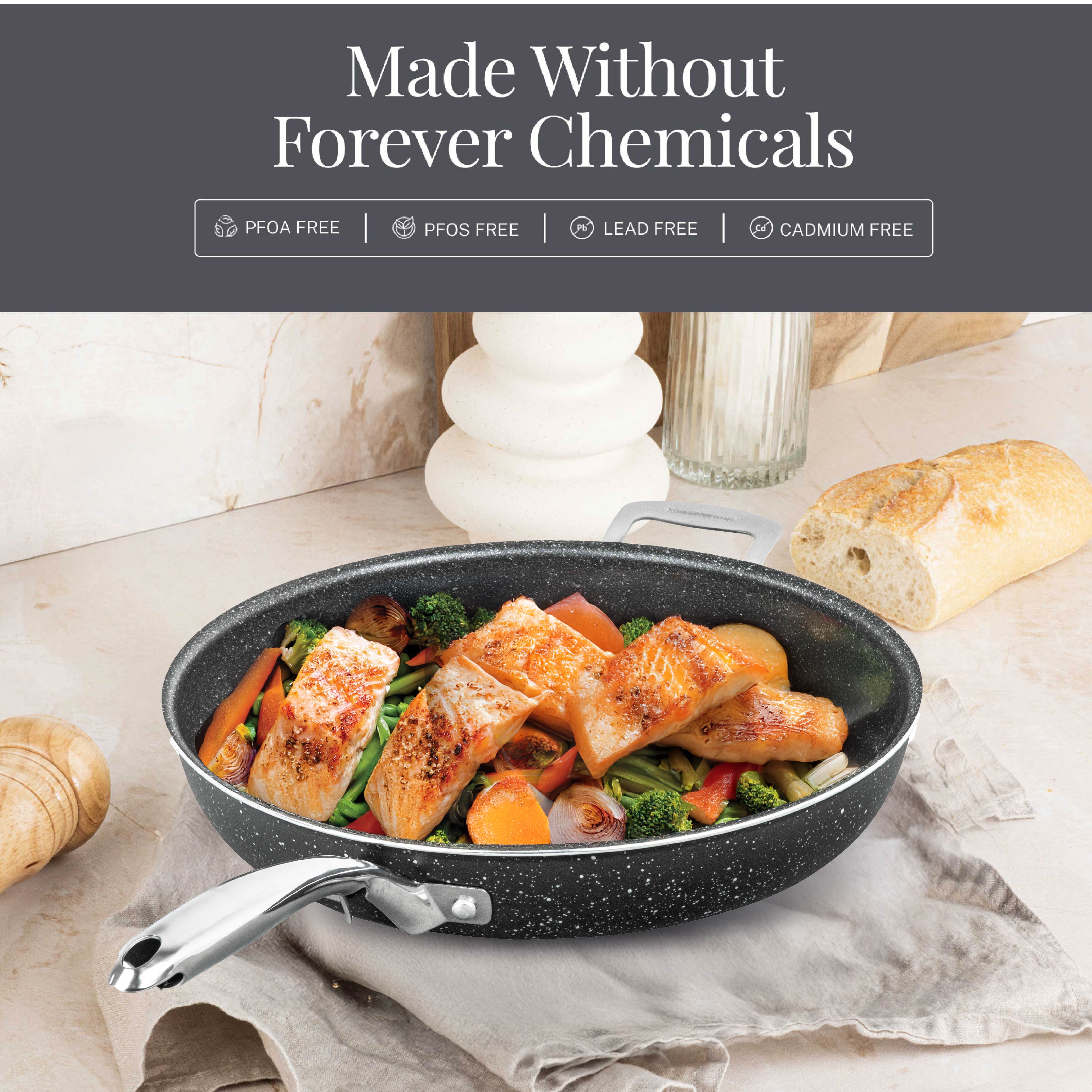 The Granitestone Ceraluxe 14 inch Fry Pan with Lid in Black Speckle is a premium, family sized ceramic nonstick skillet designed for everyday performance and healthier cooking. Its spacious 14 inch surface, glass lid, and helper handle make it perfect for big breakfasts, one pan dinners, and sautéing or searing. A nontoxic ceramic interior supports easy food release with minimal oil, while stainless steel stay cool handles provide secure control. Compatible with halogen, gas, electric, and ceramic stovetops and oven safe up to 500°F, this durable pan is made without PFOA, PFOS, lead, or cadmium and is dishwasher safe for effortless cleanup.