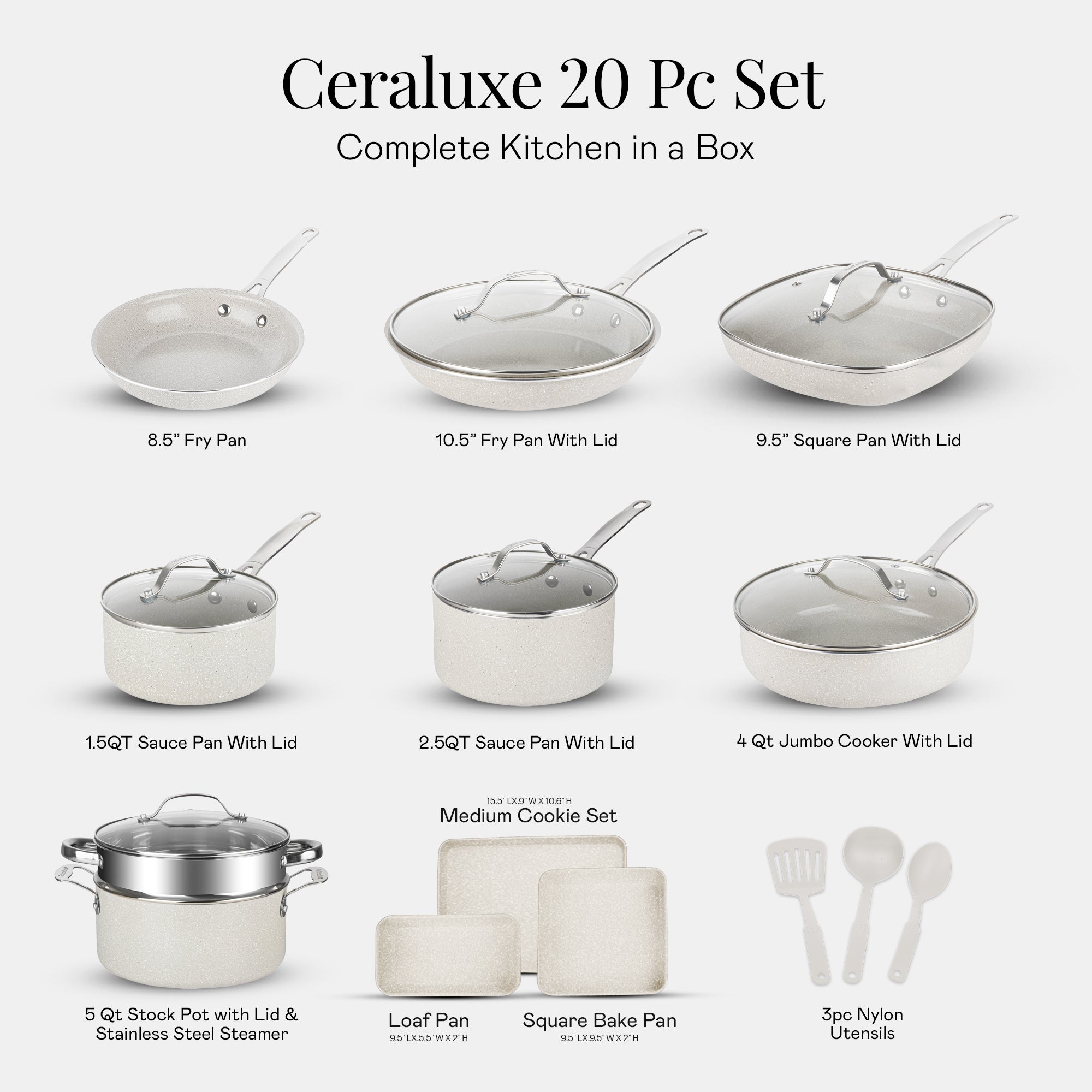 20-Piece Full Kitchen Cookware Set: Includes 8.5" skillet, 10.5" fry pan with lid, 9.5" square pan with lid, 1.5QT and 2.5QT saucepans with lids, 4QT jumbo cooker with lid, 5QT stock pot with lid and stainless steel steamer, 3 bakeware pieces, and 3 nylon utensils—ideal for daily meals or special occasions.