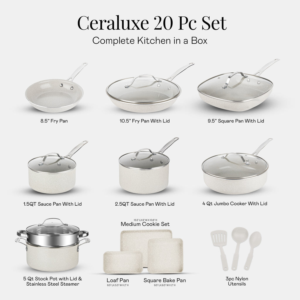 Upgrade your kitchen with the Granitestone Ceraluxe 20 Piece Nonstick Ceramic Cookware and Bakeware Set, available in elegant beige, grey, or black finishes to suit any modern décor. This premium collection of pots and pans includes fry pans, saucepans, a jumbo cooker, and a stock pot with steamer, along with bakeware and utensils—everything you need for daily cooking and weekend entertaining.