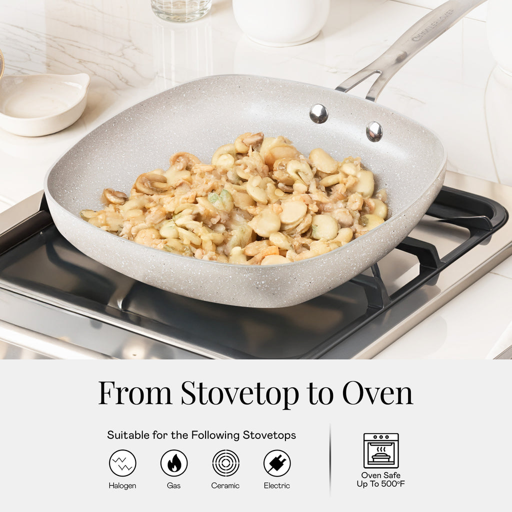 Multi-Stovetop and Oven Safe Versatility: Use this set on gas, electric, ceramic, and halogen stovetops (excluding induction). Oven safe up to 500°F, it transitions easily from stovetop to oven to table.