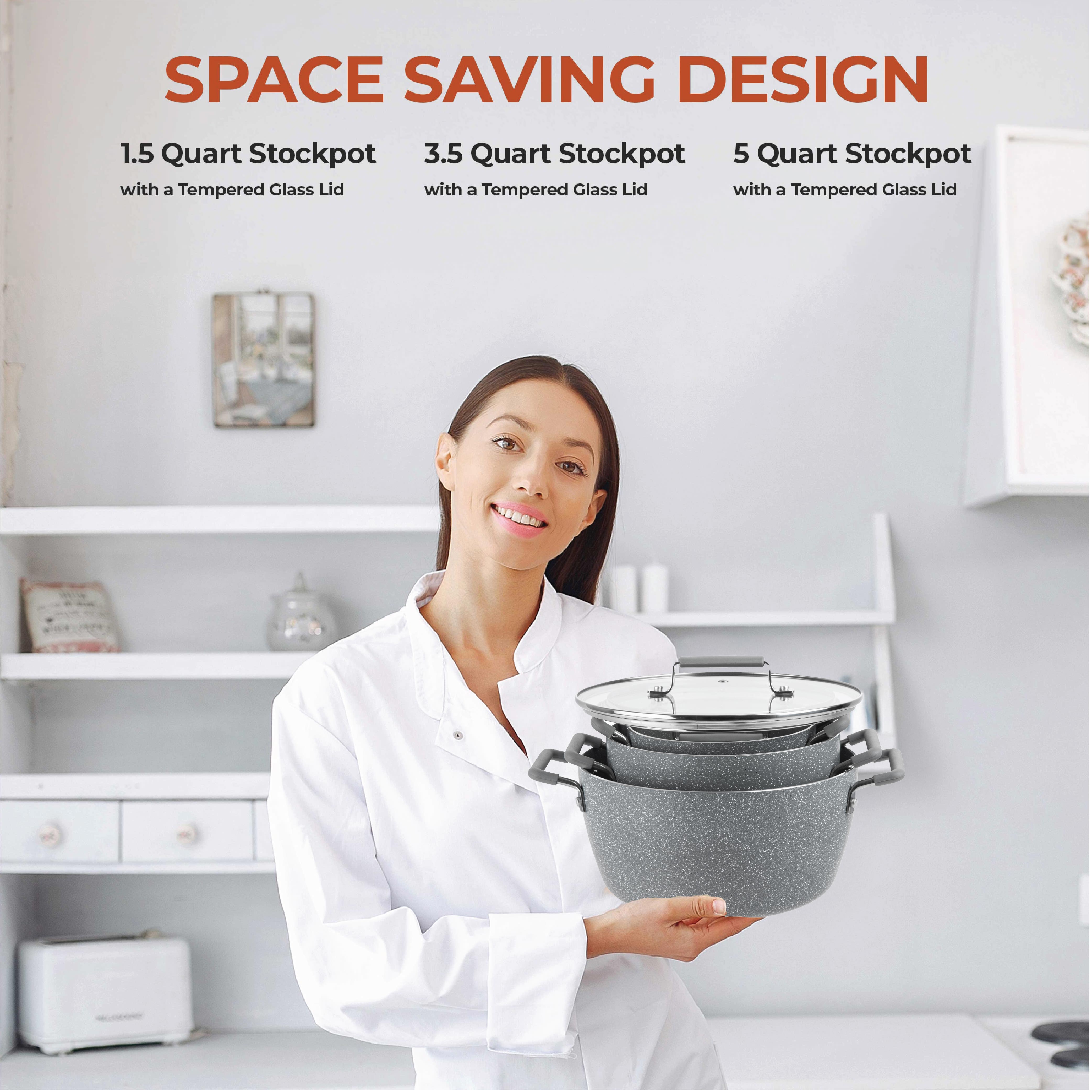 - Complete cookware set includes: 1.5 qt. saucepan with lid, 3.5 qt. stockpot with lid, and 5 qt. stockpot with lid, catering to various cooking needs from simmering to boiling