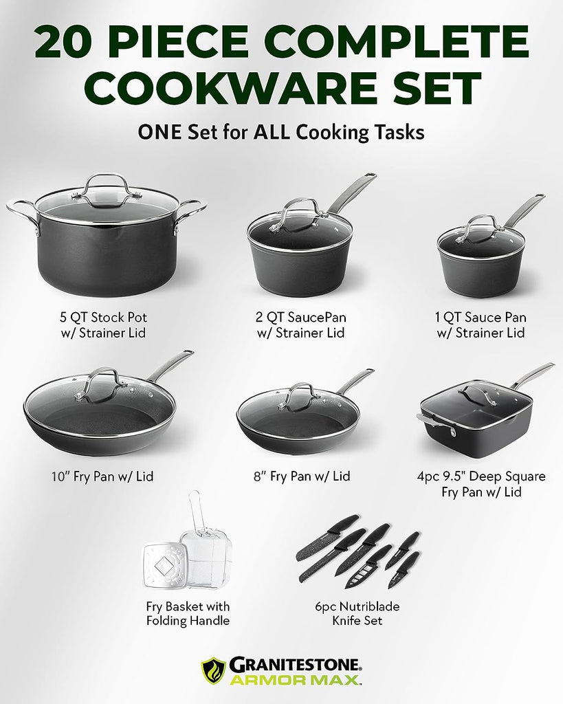 Granitestone ArmorMax 20 Piece Induction Hard Anodized Cookware Set and Knives Set
