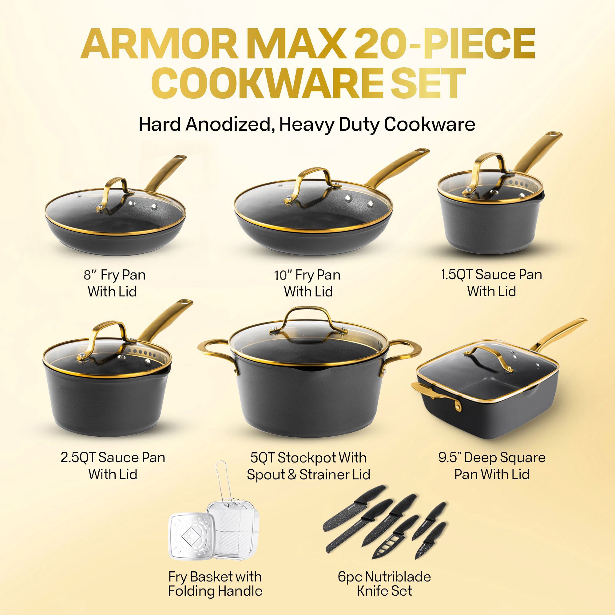 - COMPLETE KITCHEN COOKWARE SET: This Armor Max Pots and Pans Sets contains everything you need to start cooking like a pro in your home right out of the box - The set includes an 8 Inch Frying Pan with Lid, 10 Inch Frying Pan with lid, 1 Qt Saucepan with lid, 2 Qt Sauce Pan with Lid, 5 Qt sauce Pan with Lid, 6 Pc Nutriblade Knife Set, 9.5 Inch Deep Square Frying Pan with Lid, Stainless Steel Steamer Plate and Frying Basket..