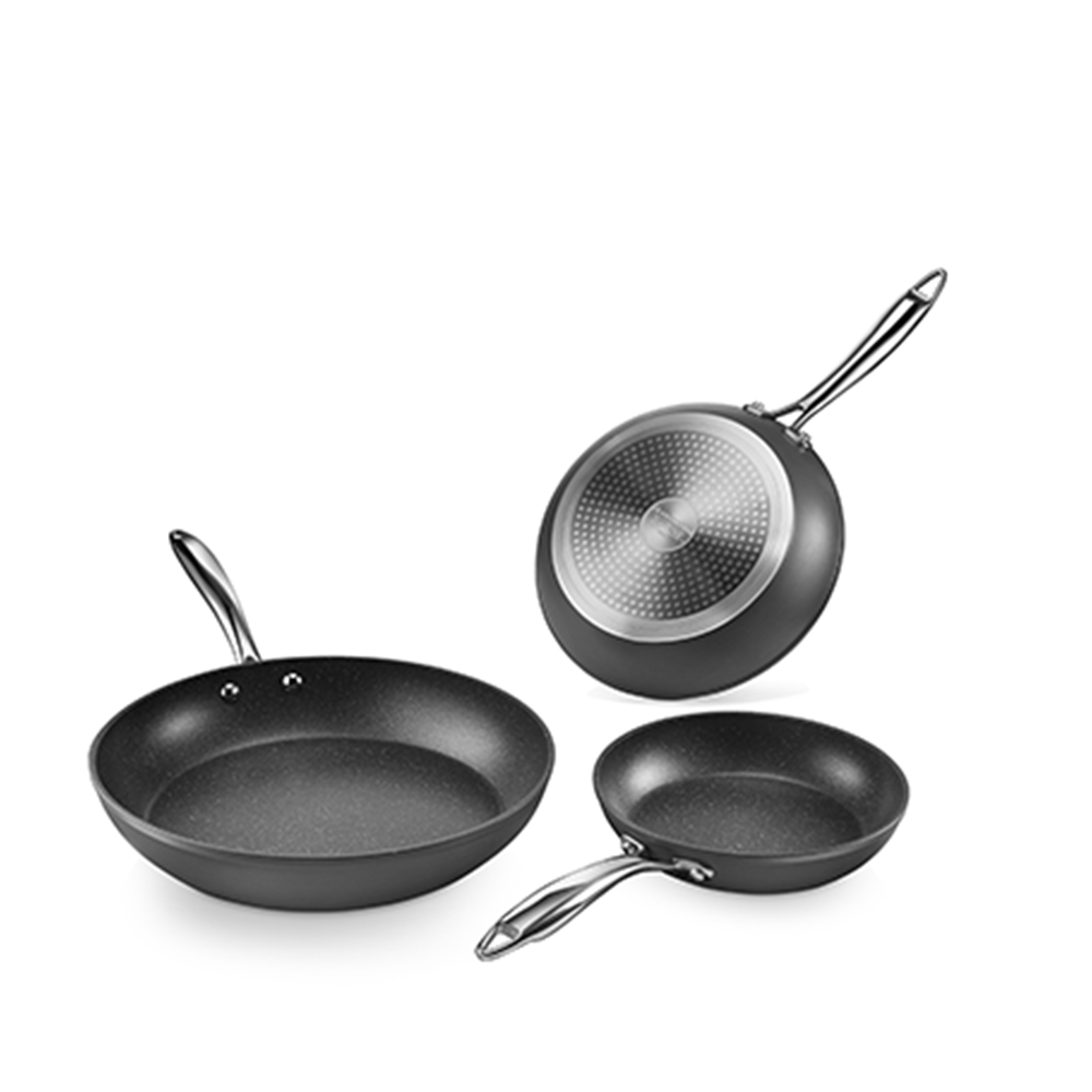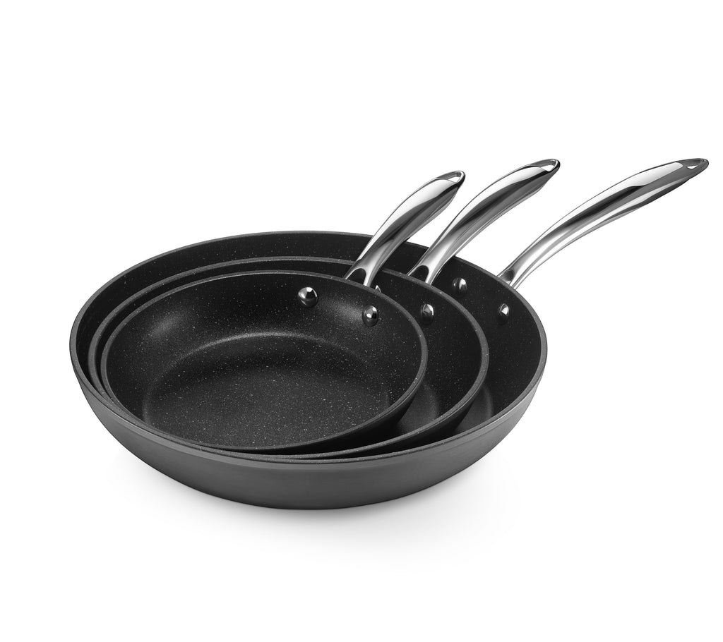 - Includes: 8 in. fry pan, 10 in. fry pan, and 12 in. fry pan